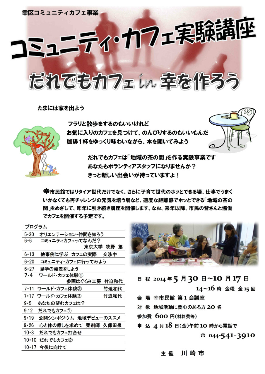 月31日開講のコミュニティ・カフェ実験講座の概略が決まりました。詳しくはチラシをご覧ください。